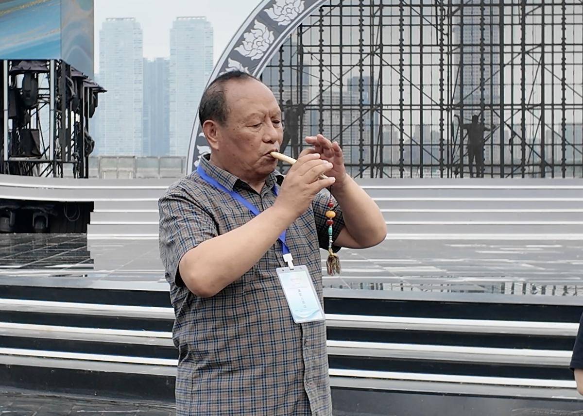 鹰笛演奏家多吉来自西藏自治区民族歌舞团,他是非遗项目藏族鹰笛艺术自治区级代表性传承人。“这是用鹰的翅骨做的,属于我们西藏的特色。这次我用它吹奏来自长江的源头的曲目。”多吉向记者展示了他吹奏十多年的鹰笛,“到了内地以后,气息更足了”多吉笑言。