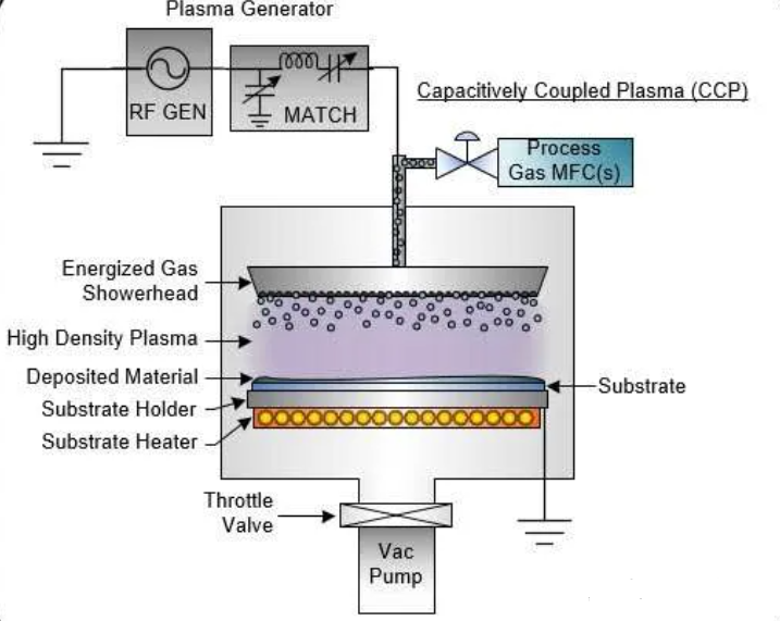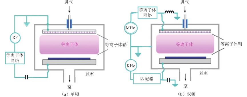 反应过程中,气体从进气口进入工艺腔体扩散至衬底表面,在射频源激发的电场作用下分解成电子、离子和自由基等,发生化学反应生成形成膜的初始成分和副反应物,以化学键形式吸附到衬底表面形成晶核,晶核生长成岛状物再形成连续薄膜,副产物从膜表面脱离并在真空泵作用下排出。